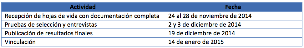 Por favor leer cuidadosamente las indicaciones acerca del proceso de selección y presentar la totalidad de la documentación requerida de acuerdo con el cronograma establecido.