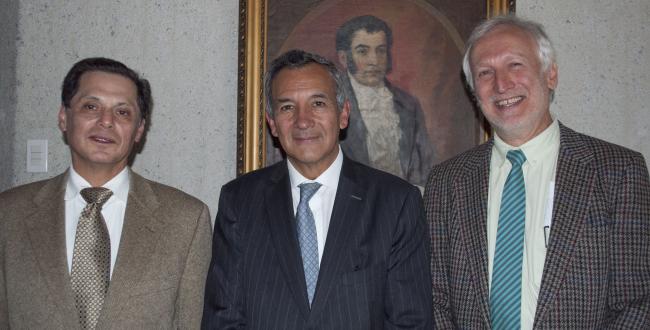 (De izquierda a derecha: Dr Diógenes Campos - Primer Decano de la Facultad de Ciencias Naturales e Ingeniería, Dr Daniel Bogoya - Decano saliente y Dr Isaac Dyner Rezonzew - Decano entrante)
