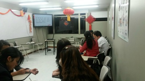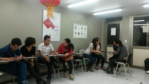 Llegó la hora de las actividades y el salón se dividió en dos grupos. El primer reto era de mímica, un integrante de cada grupo pasaba al frente e intentaba hacer que su equipo adivinara una de las expresiones que acababan de aprender. En el segundo reto cada grupo eligió cuatro palabras para hacer un diálogo, por supuesto que fue muy divertido, tener xīn sāi (心塞) –mucho estrés o mucha presión- y méng méng da (萌萌哒)-tierno- en la misma historia solo puede terminar en una telenovela. Al final todos ganaron y pasaron un buen rato, en el Club de Conversación no hay perdedores.