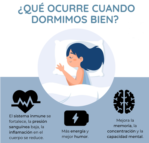 Desde el área de salud, le recordamos que el sueño de buena calidad tiene muchos beneficios para la salud, ayuda a tener mejor desempeño académico, aumenta la productividad y mejora las relaciones sociales. Dormir mal disminuye la energía, el estado de alerta y causa irritabilidad.