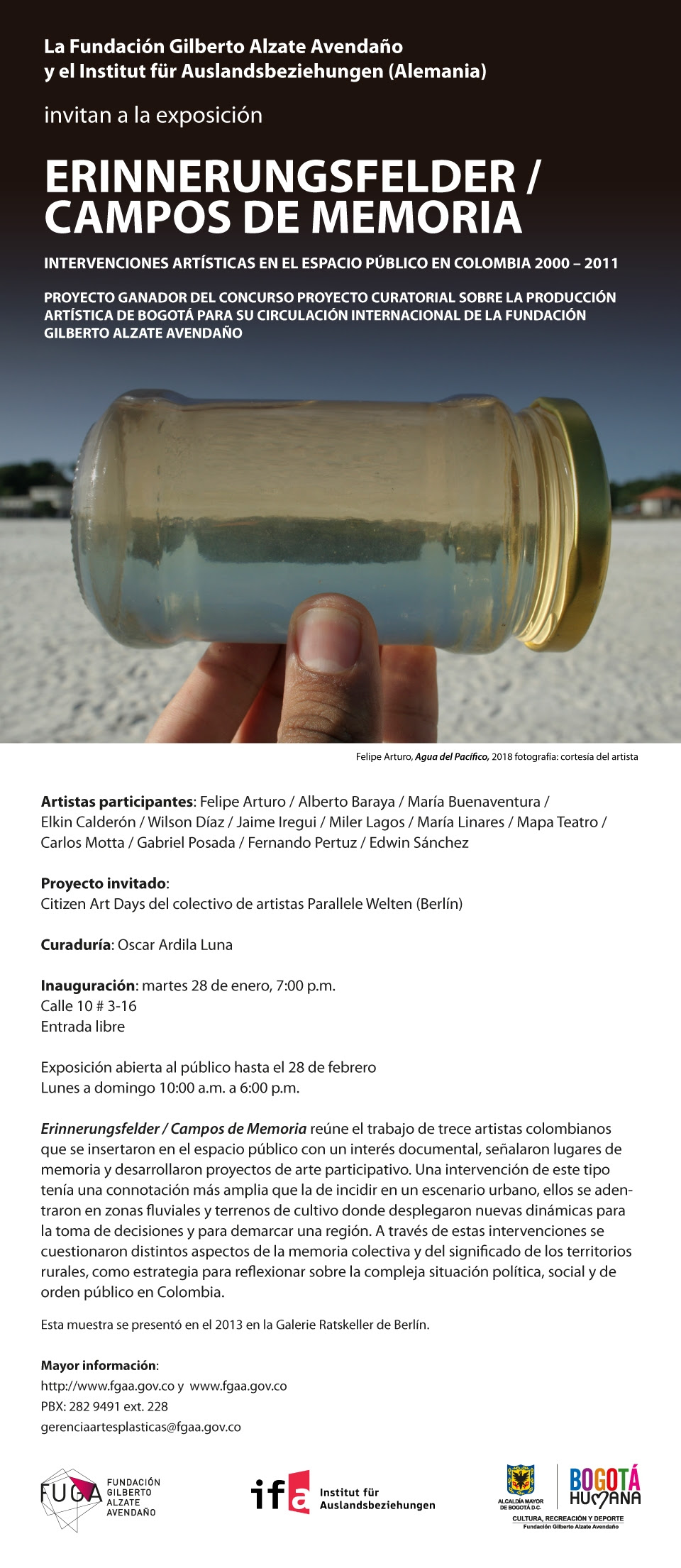 Erinnerungsfelder/ Campos de Memoria reúne el trabajo de trece artistas colombianos que se insertaron en el espacio público con un interés documental, señalaron lugares de memoria y desarrollaron proyectos de arte participativo. Una intervención de este tipo tenía una connotación más amplia que la de incidir en un escenario urbano. Por eso los artistas de esta exposición se adentraron en zonas fluviales y terrenos de cultivo donde desplegaron nuevas dinámicas para la toma de decisiones y para demarcar una región. A través de estas intervenciones se cuestionaron distintos aspectos de la memoria colectiva y del significado de los territorios rurales, como estrategia para reflexionar sobre la compleja situación política, social y de orden público en Colombia.