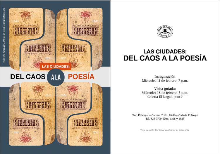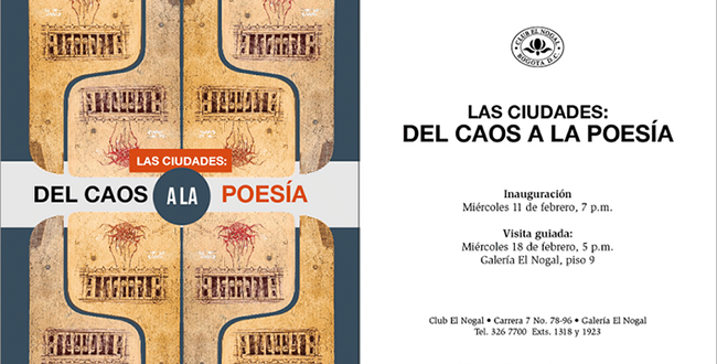 Extendemos la invitación a la exposición colectiva "Las ciudades: del caos a la poesía", curada por nuestro profesor Andrés Gaitán. La inauguración es el miércoles 11 de Febrero a las 7:00 pm en la galería del Club el Nogal. En la muestra participan algunos profesores y egresados tadeístas. Habrá también una visita guiada por la esposición el miércoles 18 de febrero a las 5:00 pm en la galería.