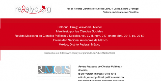 Este Manifiesto fue originalmente publicado en francés: Calhoun, Craig y Michel Wieviorka, (2013) “Manifeste pour les sciences sociales” en Socio, Penser Global. Núm. 1, marzo, pp. 3-38, y cedido para su publicación en español a la Revista Mexicana de Ciencias Políticas y Sociales, y divulgado por la Red de Revistas Científicas de América Latina, el Caribe, España y Portugal REDALYC.