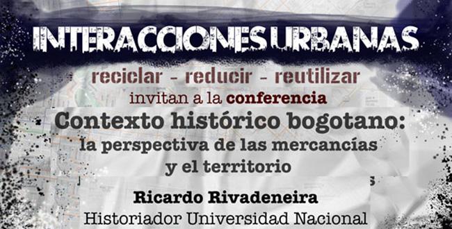 A cargo del profesor Ricardo Rivadeneira, Historiador de la Universidad Nacional. La conferencia tendrá lugar el día lunes 20 de octubre de 2014 a las 2 pm en las instalaciones de Plataforma Bogotá, Cll10 #4-28, y se realizará en el marco del laboratorio "Interacciones urbanas: reciclar, reducir, reutilizar".
