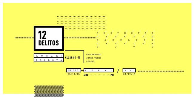 Al finalizar cada semestre del año, los estudiantes de último semestre de la Facultad de Artes de Utadeo, presentan sus Proyectos de grado. En esta ocasión en la casa Tollota, doce estudiantes titularon su exposición 12 Delitos, los cuales estarán expuestos hasta el próximo viernes 4 de diciembre.