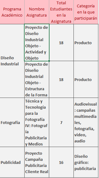Los estudiantes de cuatro asignaturas FAD (relacionadas en la siguiente tabla) van a desarrollar sus proyectos con el objetivo de inscribirlos en el PMH2022, pero cualquier estudiante que desee participar con un proyecto se puede inscribir.