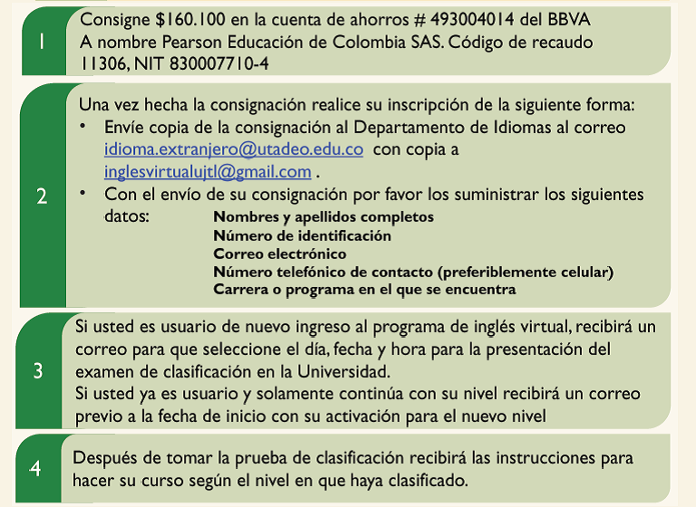 Para mayor información comuníquese con el Departamento de Idiomas, modulo 13, oficina 201. Extensión 3320, idioma.extranjero@utadeo.edu.co