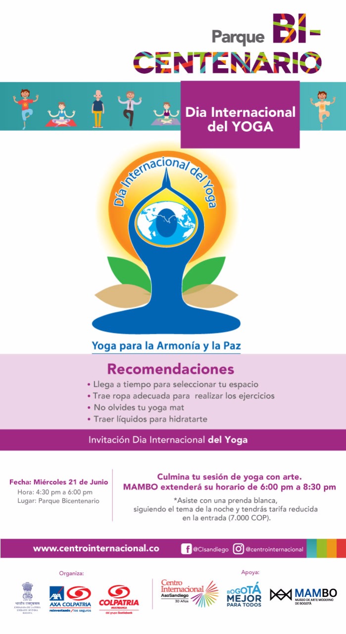 En distintas ciudades de Colombia, en cabeza de la Embajada de la India, se realizarán distintas actividades para conmemorar este Día Internacional del Yoga, una de las actividades se llevará a cabo en el Parque Bicentenario, a las 4:30 p.m.