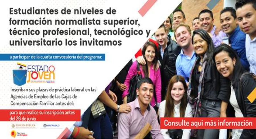Entre el 28 de mayo y el 26 de junio de 2018, los estudiantes interesados en realizar sus prácticas laborales en el sector público podrán inscribirse al Programa Estado Joven, iniciativa desarrollada por el Ministerio del Trabajo y el Departamento Administrativo de la Función Pública, y con el apoyo de la Unidad Administrativa Especial del Servicio Público de Empleo, que tiene por objetivo facilitar los procesos de transición del ciclo de aprendizaje al mercado laboral de los jóvenes, a través de incentivos como auxilio de un salario mínimo mensual, y aseguramiento en los subsistemas de seguridad social en salud, pensiones y riesgos laborales, para la realización de prácticas laborales y judicaturas en el sector público.