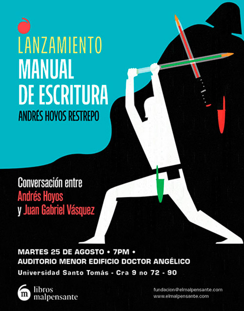 Este Manual de escritura será presentado al público en una conversación entre Andrés Hoyos, autor del libro, y el escritor Juan Gabriel Vásquez, premio Alfaguara de Novela en 2011. El libro estará disponible en librerías y para venta directa a través de El Malpensante.