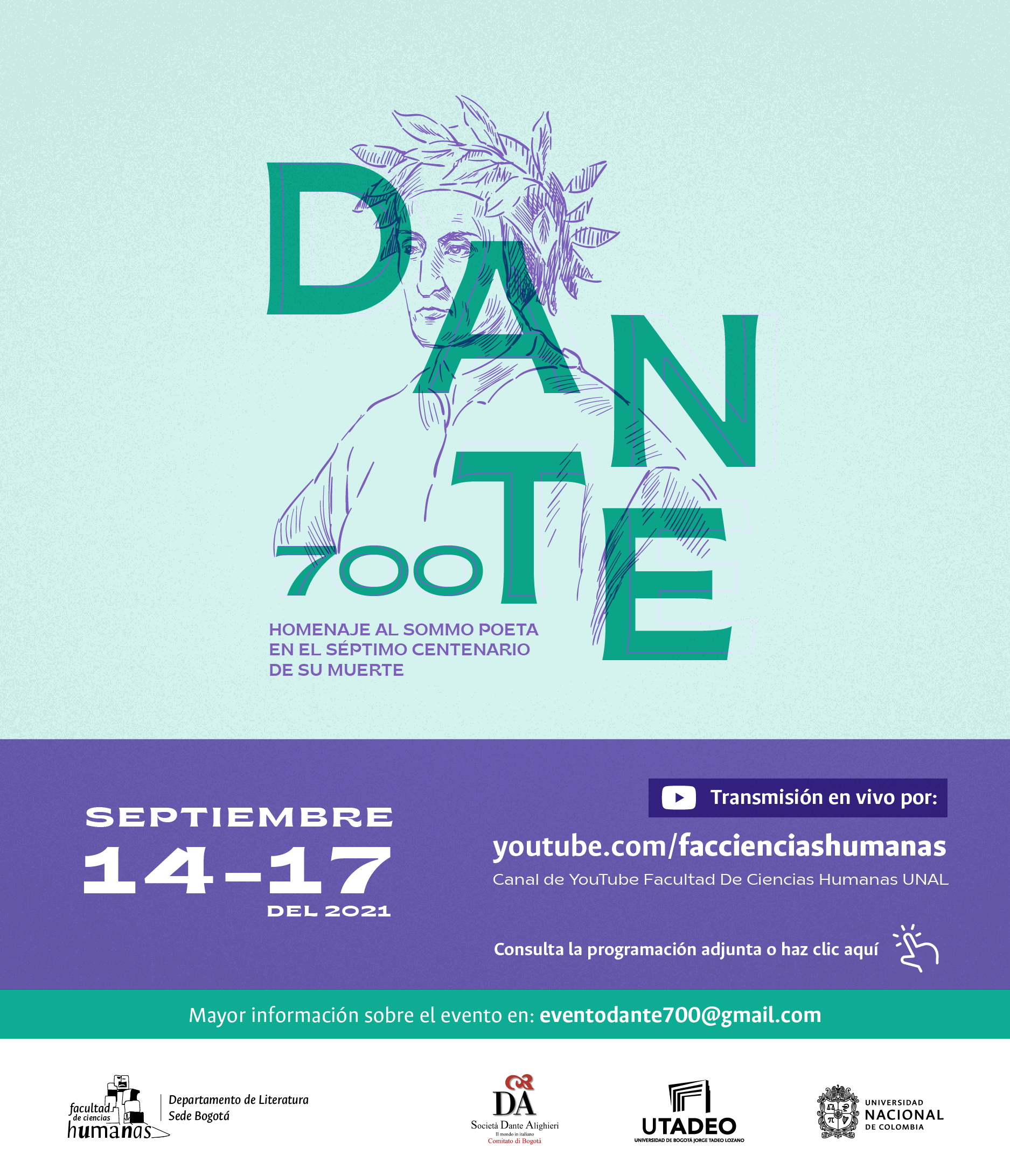 El 14 de septiembre de 1321, en Rávena, muere Dante Alighieri, autor de la Vida Nueva, del Convivio, del De Monarchia y de las tres cánticas de la Comedia, y uno de los poetas más grandes de todos los tiempos. Desde Colombia, Utadeo y la Universidad Nacional, suman sus voces al homenaje que le rinde en esta ocasión la humanidad entera, a este gran poeta, con el evento “Dante. 700 años”, el cual contará con diferentes actividades en torno a la obra de Dante en las que podrás participar, así como seguir las charlas de los diferentes invitados internacionales.