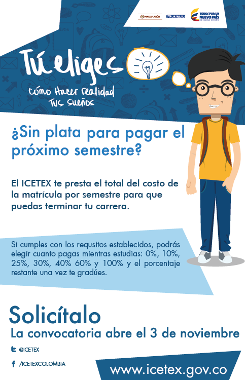 Hoy, de 1 a 3 p. m., el ICETEX estará realizando la charla ‘Toma de las Universidades’, un espacio en el que podrá informarse sobre la convocatoria que realiza el instituto respecto a las modalidades de créditos para el primer periodo académico del 2017.