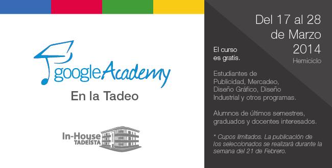 Google Academy es un programa de capacitación y certificación en Google AdWords, la plataforma de gestión publicitaria digital de Google. Por medio del curso es posible obtener un diploma de reconocimiento a nivel mundial en el conocimiento y manejo de dicha herramienta. Los alumnos que finalicen el curso ingresarán a una bolsa de trabajo que Google comparte con sus agencias estratégicas. El Programa de Publicidad en asocio con Google estará realizando del 17 al 28 de marzo de 2014 este evento, si desea participar puede inscribirse dando clic aquí. La duración del curso es de dos semanas y está dividido en dos módulos de 3 sesiones (4:00PM a 7:00PM) y 1 examen cada uno. El segundo módulo solo podrá ser cursado en caso de aprobar el primer examen.
