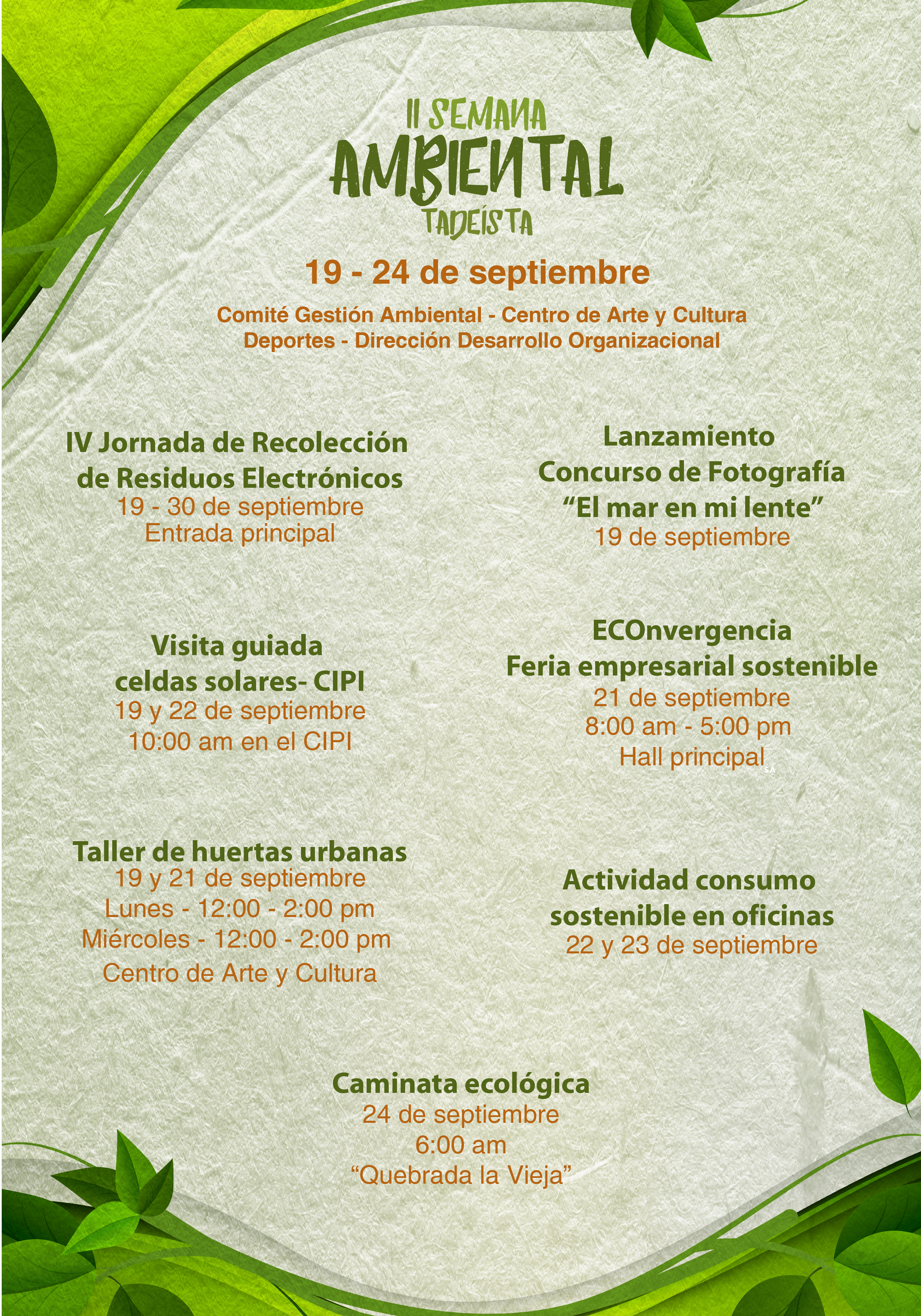 Si está interesado en estos temas lo invitamos a participar en las actividades programadas para la II Semana Ambiental Tadeísta. Esta semana se programa con el objetivo de promover dentro de la Comunidad Tadeísta el compromiso ambiental y la importancia de proteger nuestros recursos naturales para las generaciones presentes y futuras a través de pequeñas acciones que se pueden realizar en el día a día. La semana se realizará del 19 al 24 de septiembre.