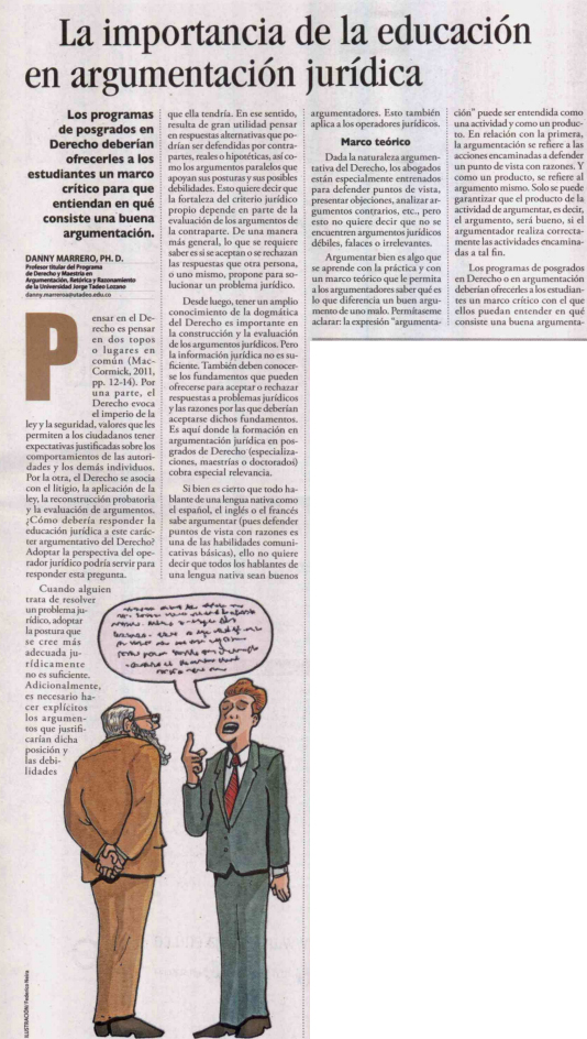 La revista Ámbito Jurídico publicó el 28 de mayo, en su versión impresa y digital, un artículo escrito por el profesor de Utadeo Danny Marrero, Ph. D. sobre la importancia de la educación en argumentación jurídica. Marrero sostiene que en el momento en que alguien intenta solucionar un problema jurídico, adoptar una posición adecuada jurídicamente no es suficiente, sino que es necesario que los individuos posean argumentos explícitos que justifiquen dicha posición y sean conscientes de las debilidades a las que su posición podría enfrentarse. Esto sugiere que la educación jurídica necesita cierta preparación adicional para que funcione de mejor manera.