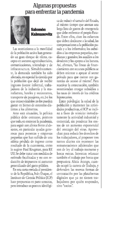 En su análisis, aborda la propuesta que hizo el Instituto de Ciencia Política (ICP) al presidente Iván Duque en la que, para el profesor Kalmanovitz, se inclinan más por reactivar la economía a costa del número de personas que se vean contagiadas. Pero, además de ello, pasan por encima de los derechos laborales de estas personas, al proponer que se trabaje en tres turnos, lo que implicaría pago de horas extra y trabajo nocturno.