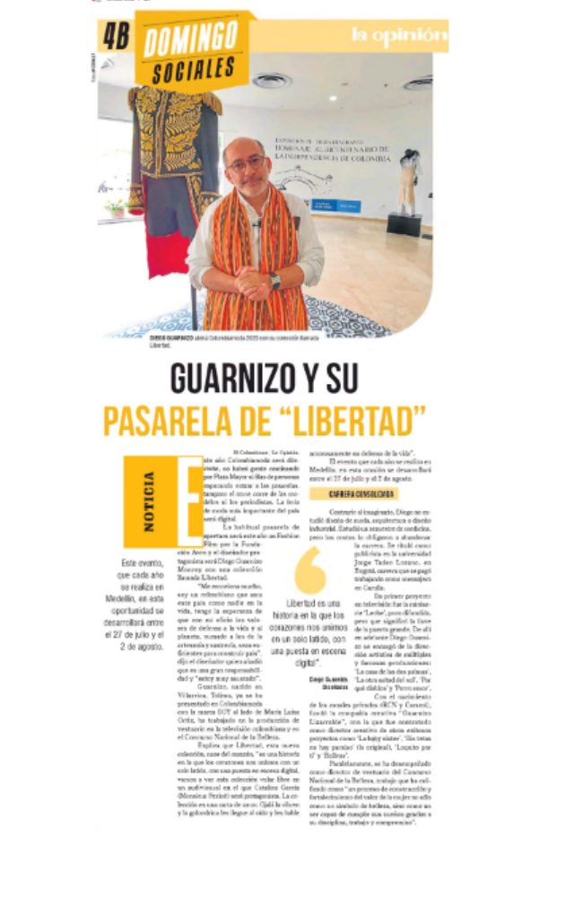 Este año Colombiamoda se desarrollará entre el 27 de julio y el 2 de agosto. Según sus organizadores, el gran ausente será el corre corre de las modelos en las pasarelas; el evento que tradicionalmente se realizaba en la ciudad de Medellín, tocará las puertas de la virtualidad y lo hará de la mano del diseñador tolimense Diego Guarnizo, con su colección 'Libertad'.