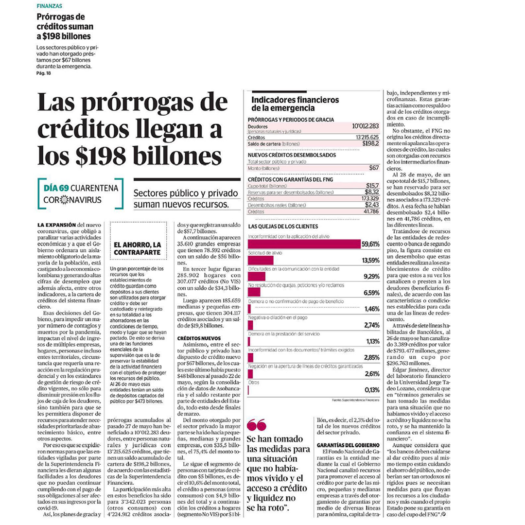 Las decisiones del Gobierno Nacional para evitar un mayor número de contagios y muertos por la covid-19 han impactado el nivel de ingresos de múltiples empresas, hogares, personas e incluso entes territoriales. Ante este difícil panorama, se expidieron normas para que las entidades vigiladas por parte de la Superintendencia Financiera dieran algunas facilidades a los deudores que no puedan continuar cumpliendo con el pago de sus obligaciones. Hoy, las prórrogas de créditos llegan a los $198 billones.