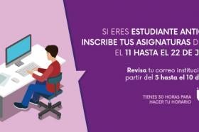 NovedadesJunio 30 / 2016Los turnos para inscribir asignaturas van hasta el 22 de julio. Esté pendiente de su correo electrónico institucional desde el 5 de julio para que revise la fecha y hora asignada de la cita para realizar su horario.