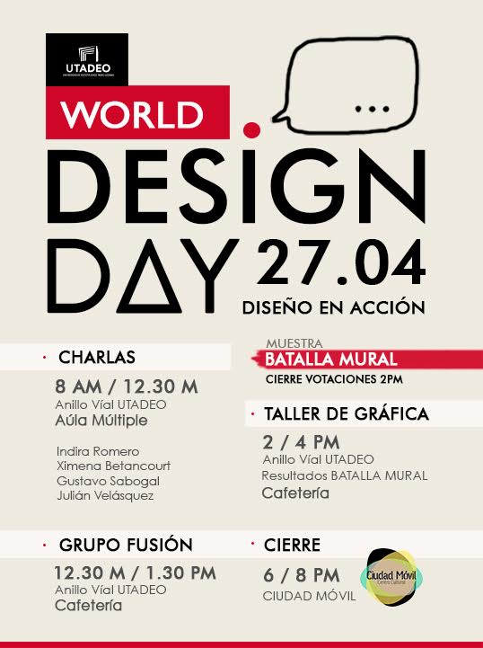 El próximo miércoles nos reuniremos para celebrar el Día Mundial del Diseño, las actividades se desarrollarán en espacios alternativos de clase, por tal motivo para todos los estudiantes con clases durante ese día su presencia en la la jornada es obligatoria, su asistencia a las actividades será validada por sus docentes quienes también nos acompañarán. Contaremos adicionalmente con la presencia de la maestra Rosario Gutiérrez Directora Nacional del programa de Diseño Gráfico.