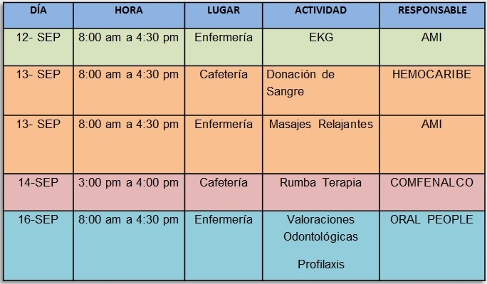 La Coordinación Administrativa de la Universidad Jorge Tadeo Lozano, Seccional del Caribe invita a todos sus funcionarios a participar de la Semana de la Salud y Seguridad en el trabajo, que se desarrollará del 12 al 16 de septiembre.