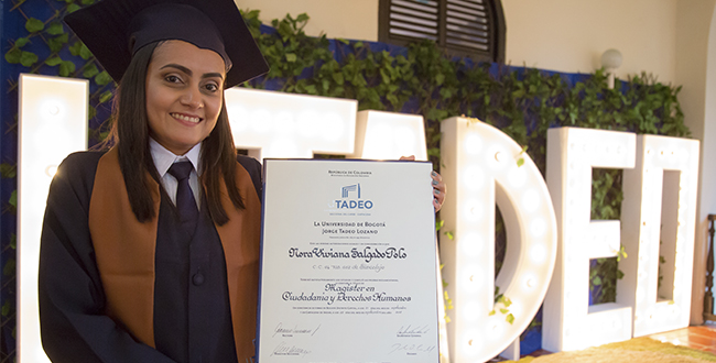 Nora Salgado es sincelejana, abogada y especialista en Derecho Administrativo. Cursó la Maestría en Ciudadanía y Derechos Humanos y al hablar con ella sobre su paso por el programa de la Seccional del Caribe afirmó: "Es un privilegio que me llena de mucha emoción ser la primera en abanderar el grupo de magisters que se graduarán en Utadeo Caribe... Hay un aprendizaje muy importante que me llevo de este paso por la Universidad, y es que la maestría la construímos entre todos entre todos los estudiantes, cuando necesitamos hacer ajustes y dar a conocer temas específicos, la Tadeo siempre nos escuchó y tomaron nuestras en cuenta todos los comentarios, para hacernos sentir satisfechos".