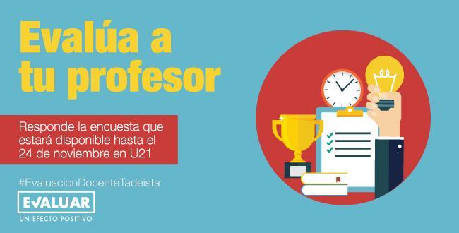 Llega nuevamente el momento de la Encuesta de Evaluación a la Docencia para el periodo 2018-2S, que estará disponbible en U21 hasta el 24 de noviembre 2018. La Evaluación tiene como objetivo garantizar la calidad de los procesos educativos y pedagógicos al interior de la Universidad, y está enmarcada en la visión institucional de aprendizaje centrado en el estudiante.